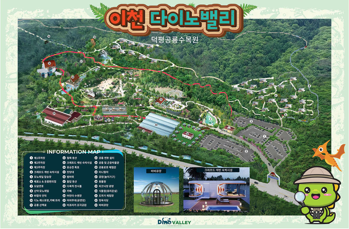 25만 평방미터 중 13만 평방미터는 개발되지 않은 천연의 상태로 산림욕장의 리프레쉬 기능을 담당하고 있으며, 나머지 공간에는 주요 테마인 공룡들이 수목원 내에 조성되어 어린 아이들과 가족들에게 재미와 추억을 제공하고 있습니다. 공룡테마관에는 3D 공룡 영화가 상시 상영 중이며, 이 밖에도 온실 정원, 어린이들을 위한 체험 프로그램 등 많은 볼거리와 놀거리가 조성되어 있습니다.